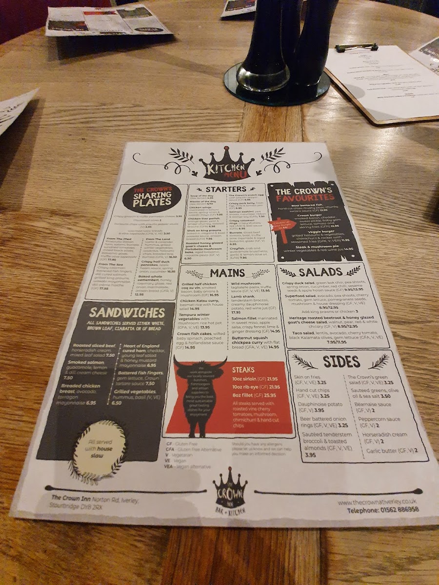 The Crown’s menu is approachable, with plenty of variety to suit different tastes and occasions. It reflects a place where people enjoy good food in a comfortable setting—whether it’s a weekday lunch, a festive meal, or a leisurely Sunday roast.